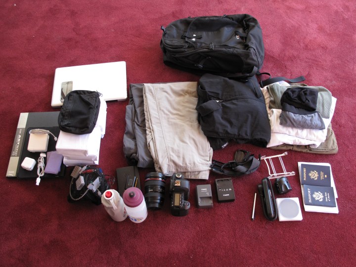 With a new trip comes new gear for travel! We’ve learned a lot from our two previous tours to the Midwest, East Coast and Southwest. Our current goal is to be able to bring one carry-on bag that can fit under the airplane seat! With that in mind, I’ve adjusted our gear list with the following new additions. Here’s a photo of mostly what I’m taking with me on the trip.
